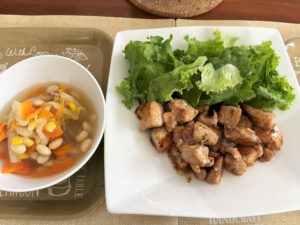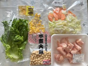 ハニーマスタードチキン (カットミール) ヨシケイ X Facebook はてブ Pocket LINE コピー 2022.08.102022.08.16 8/10は洋風だね ハニーマスタードチキンお豆と野菜のコンソメ煮 人参と白菜と鶏肉はカットされてるし、グリーンリーフはちぎるだけ!簡単そう カットされた人参と白菜たち。冷凍コーンはタイ産 水煮大豆はヨシケイで使うようになったけど・・使いやすいね 漬け込んだ鶏肉を焼いて、はちみつと粒マスタードを混ぜてからめるだけ♪ 今回は結構簡単にできたので楽だったよ。味も美味しくできて満足! ごちそうさまでした。