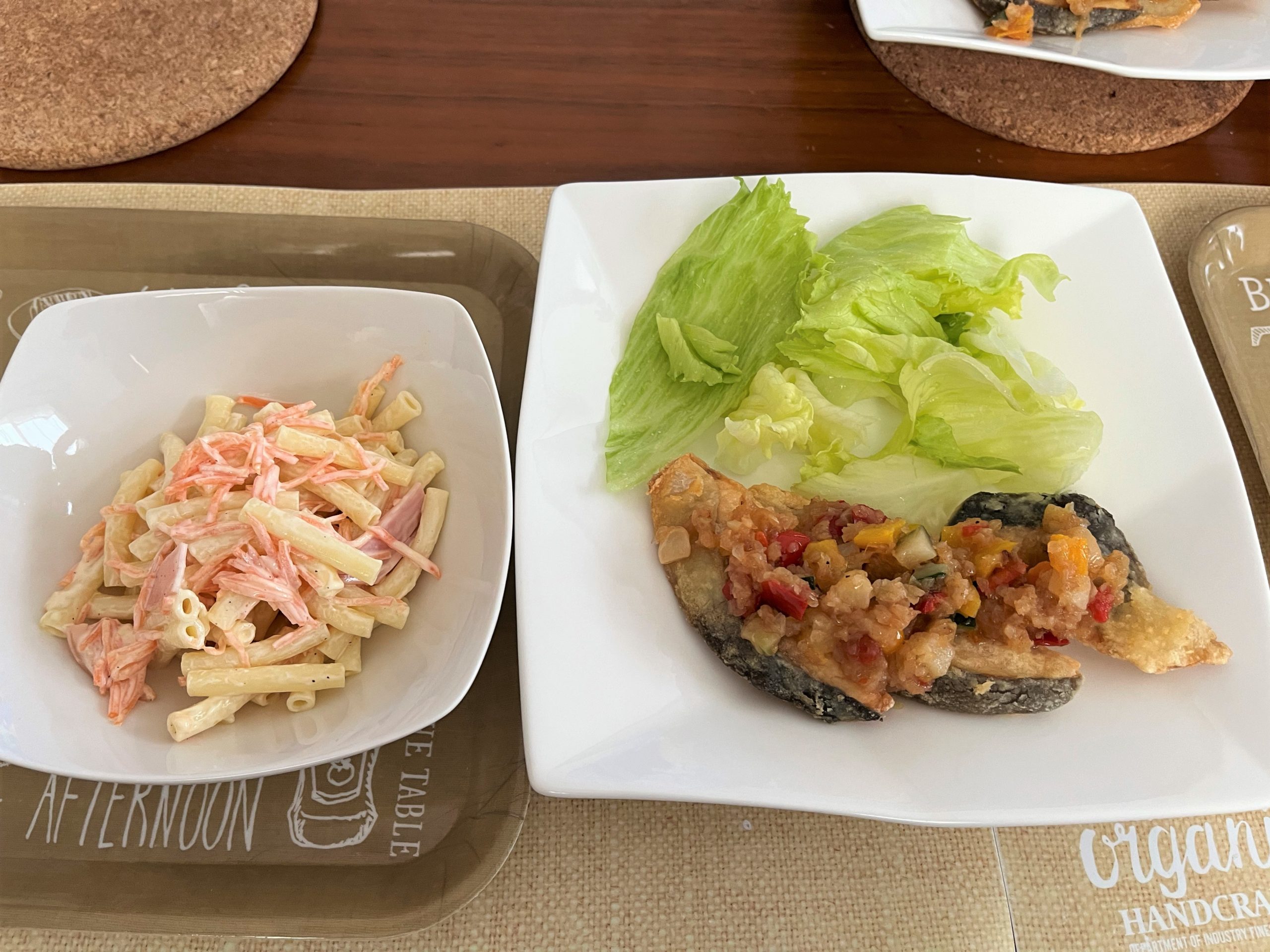 8/12は サーモンのテビゴットソース?ハムマカロニサラダ