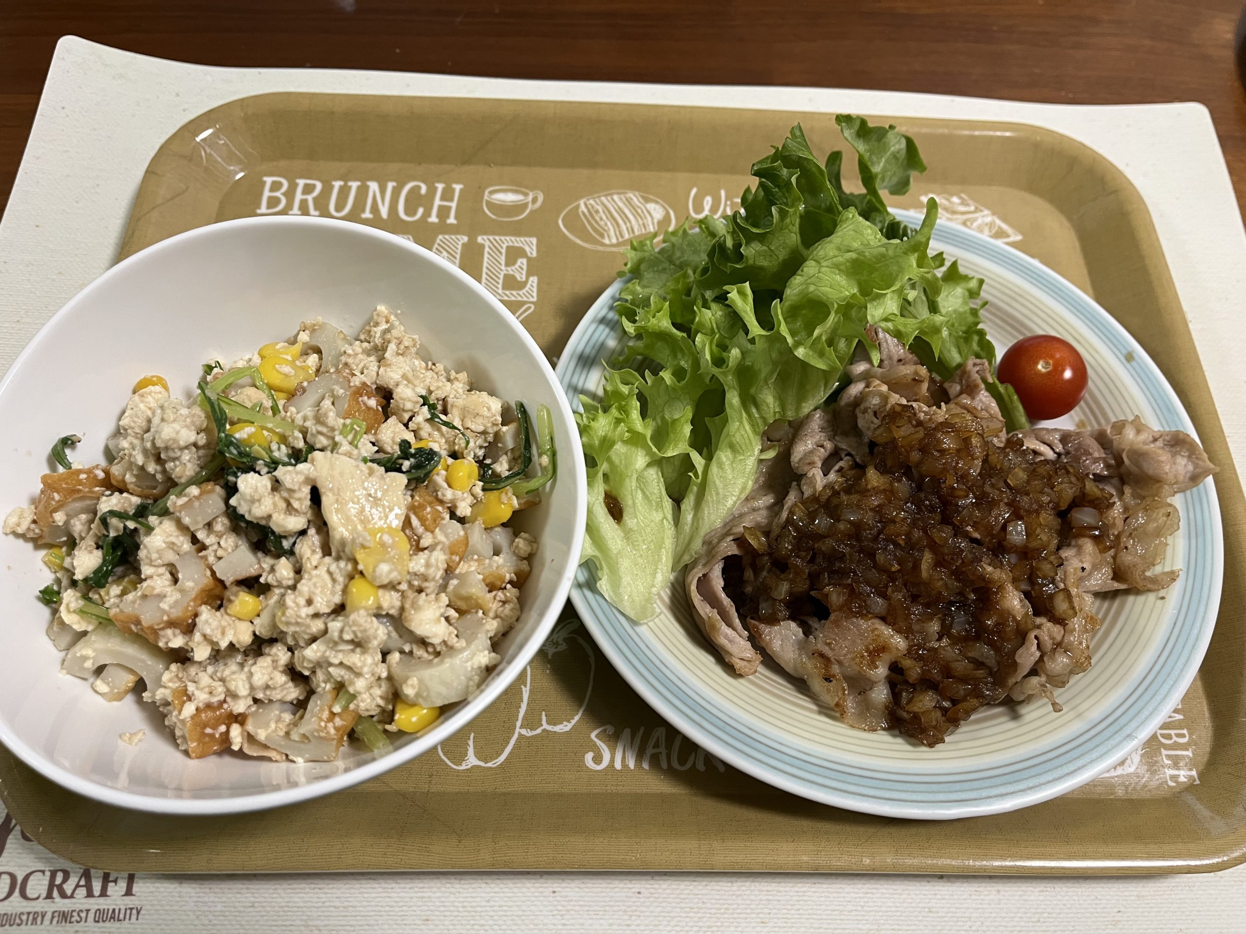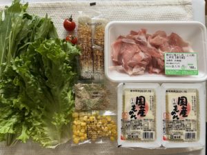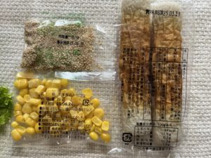 豆腐にすりごま、砂糖&塩&醤油を加えてすり混ぜて、水菜、コーン、ちくわを和えて完成。