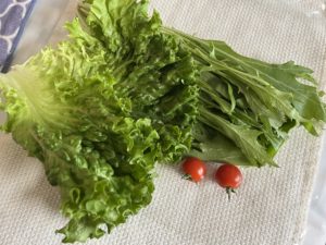 グリーンリーフ&水菜『福岡』、ミニトマト『長崎』、玉ねぎ『北海道』