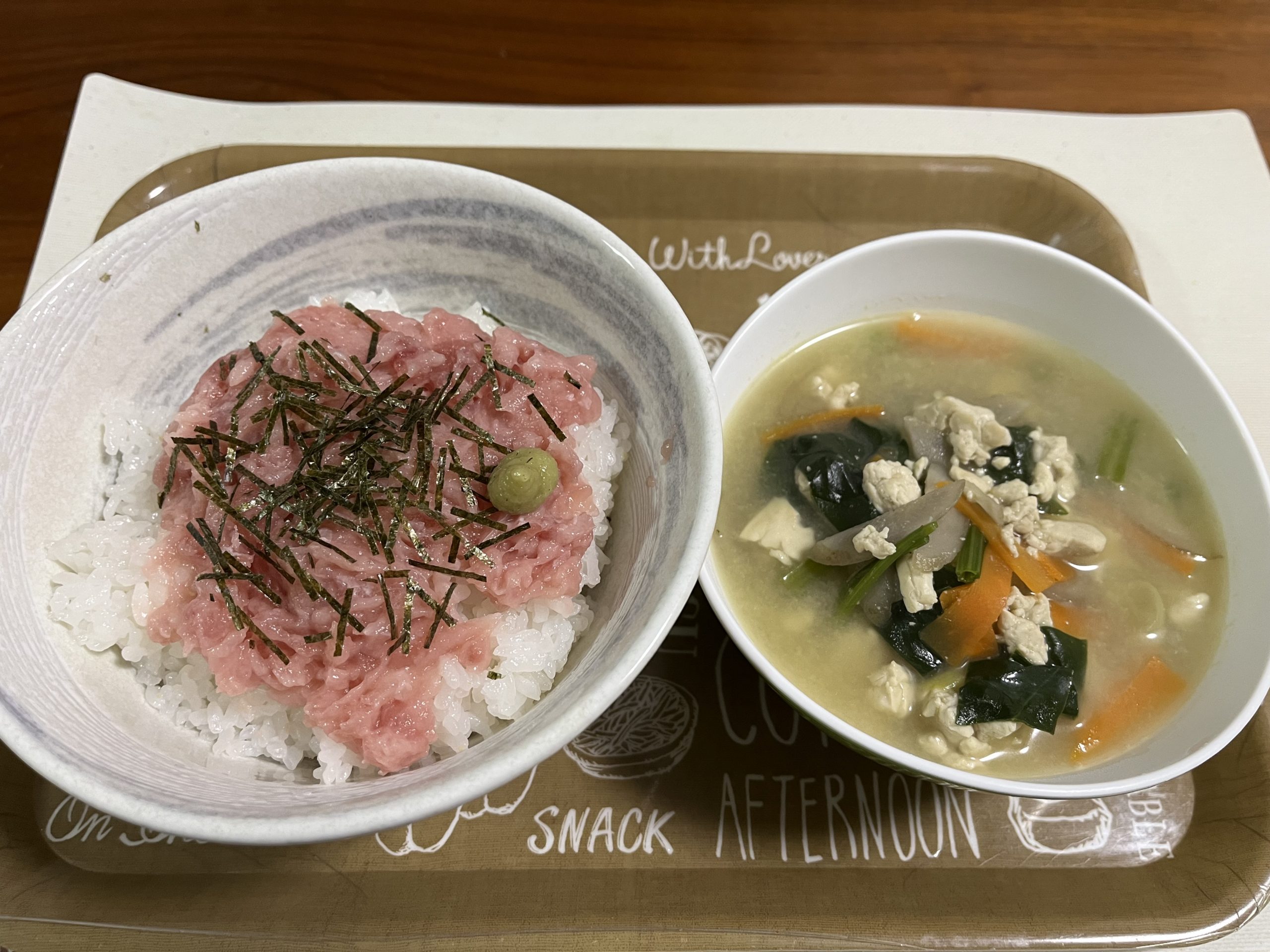 まぐろのたたきが油脂が多かったのかあまり美味しさを感じなかったので醤油多めにかけて食べた。ヨシケイのマグロはあまり美味しくないかなぁ。。