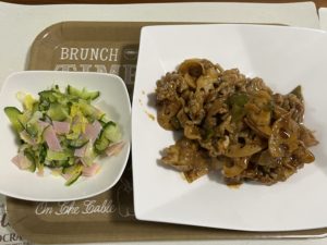 豚肉と野菜を炒め、蓋をして蒸し焼きにし、黒酢だれを加えて絡め塩コショウで味を調えごま油をふって完成。