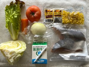 『野菜とマカロニのクラムチャウダー』鍋に水&コンソメ、人参&玉ねぎ&キャベツを入れて煮立て、マカロニ加えて煮る。火が通ったら牛乳を入れてサッと煮、塩コショウして味を調える。
