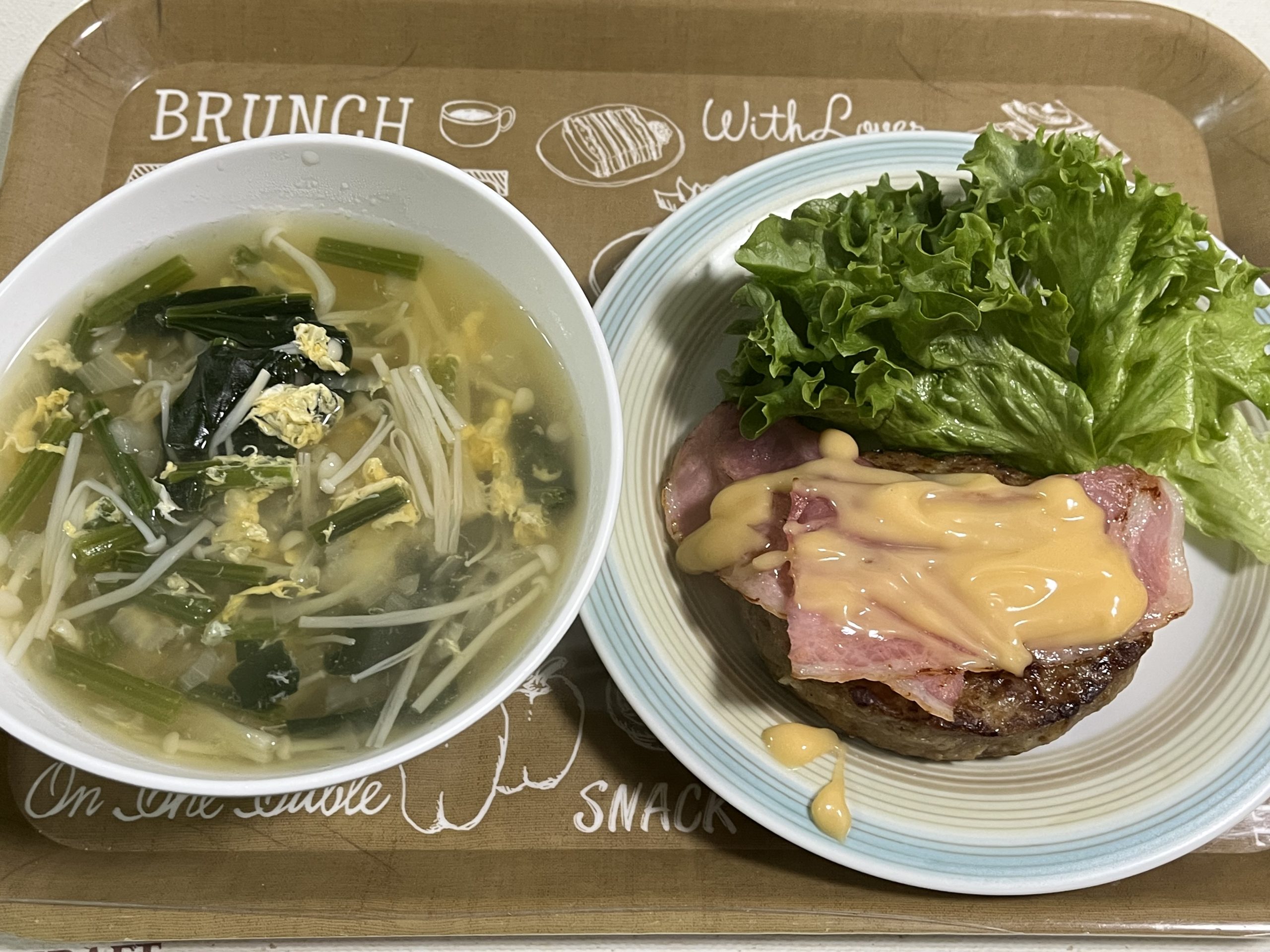 『ベーコン&ハンバーグ~チーズソースがけ~』ハンバーグは電子レンジ加熱。ベーコン焼いてハンバーグにのせ、チーズソースかけるだけ。
