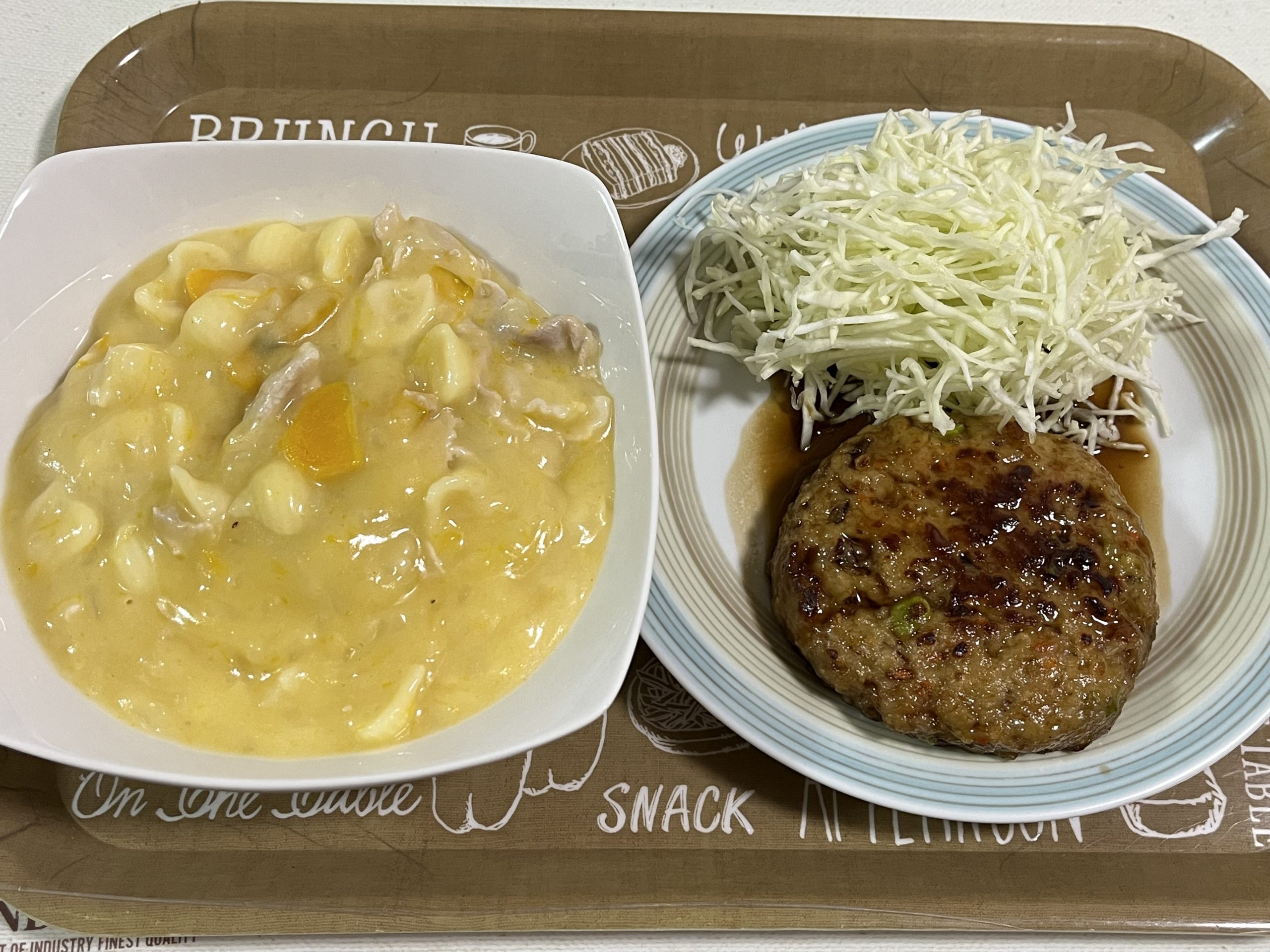 やわらか豆腐野菜ハンバーグ(プチママ) ヨシケイ X Facebook はてブ Pocket LINE コピー 2025.05.08 5/8も『プチママ』2品です ・やわらか豆腐野菜ハンバーグ ・マカロニ入りパンプキンシチュー やわらか豆腐野菜ハンバーグマカロニ入りパンプキンシチュー すべての材料は 野菜の産地は キャベツ『福岡』、玉ねぎ『北海道』、かぼちゃ『ニュージーランド産(海外)』 冷凍ハンバーグは電子レンジで加熱するだけ。 シチューも材料煮込んだらシチューミックス加えて完成! どちらも美味しくてシチューの量が多かったよ ごちそうさまでした♪