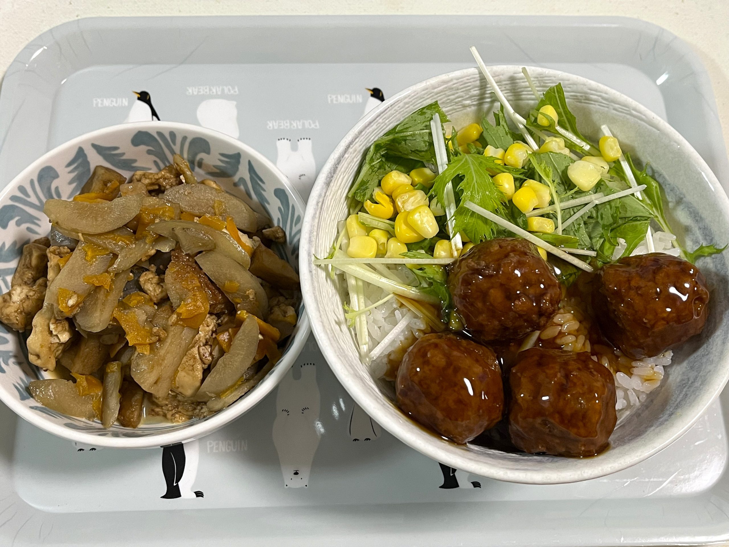 てりやき肉団子丼(プチママ) ヨシケイ X Facebook はてブ Pocket LINE コピー 2025.07.18 7/18までプチママ♪ ・てりやき肉団子丼 ・おかずけんちん煮 てりやき肉団子丼おかずけんちん煮 材料は・・ 野菜は葉物が少し枯れてる程度かな 肉団子は『テーブルマーク』茹でるだけなのでとっても簡単! ヨシケイの豆腐は大豆がアメリカ産がほとんど とうもろこし『ベトナム産』五目揚げの材料は『ベトナム産』『タイ産』こんにゃくは日本産かな ヨシケイではこの大きな肉団子がたまに出てくるけど、美味しくて簡単でお気に入り♪ 『けんちん煮』も全部煮込むだけで簡単だったよ ごちそうさまでした♪