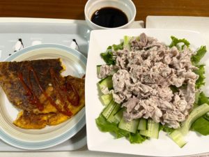 左のオムレツは1人分、右の豚しゃぶサラダは2人分。