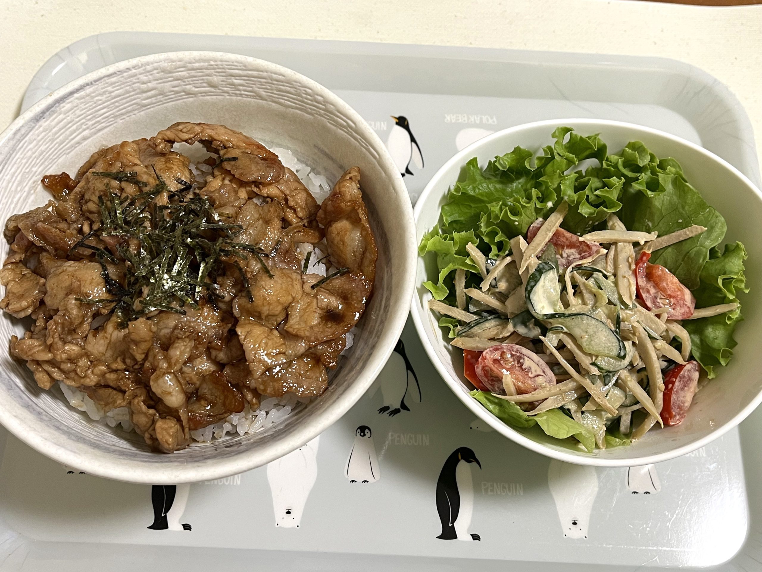 甘旨!豚丼(プチママ) ヨシケイ X Facebook はてブ Pocket LINE コピー 2025.08.04 8/4も簡単なプチママ ・甘旨!豚丼 ・ごぼうのごまマヨサラダ 甘旨!豚丼ごぼうのごまマヨサラダ 材料↓ 野菜の状態は・・・ミニトマトも赤々として美味しそう ごぼうを細く切って茹でるのが少し面倒かな~と思ったけど マヨ&醤油で和えると美味しいに決まってる! 材料だけ見ると少ないかな?と思ったけど普通の量はあったと思う。 ご飯の量は250gあるからガッツリだよ。 ごちそうさまでした♪