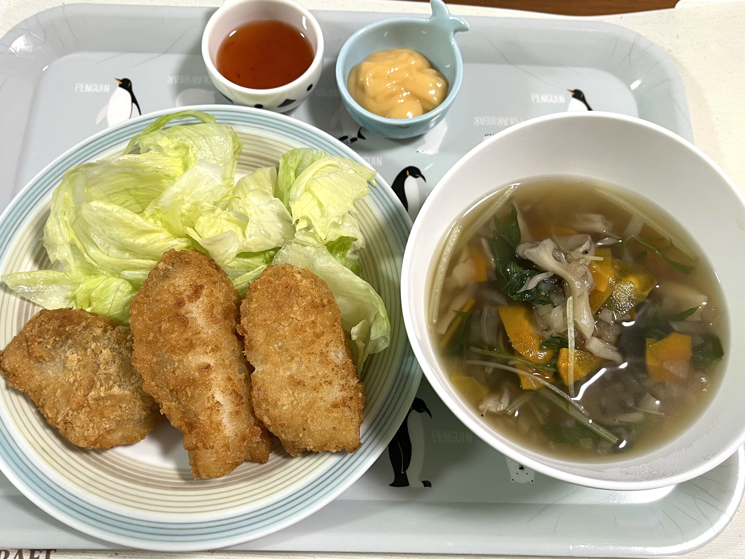 2種のソースで食べる!白身魚フライ(カットミール) ヨシケイ X Facebook はてブ Pocket LINE コピー 2025.08.14 8/14もカットミール ・2種のソースで食べる!白身魚フライ ・きのこと水菜のコンソメスープ 2種のソースで食べる!白身魚フライきのこと水菜のコンソメスープ 材料は 水菜とレタス、少し元気なさげ カットされた玉ねぎは大きすぎたので更にカット。右はソースたち。 魚はタラでロシア産です 苦手な水菜も温めると食べやすかった。 スイートチリソースは美味しかったけど、チーズソースは変わった味がして・・ 結局ポン酢かけて食べました。 ごちそうさまでした♪