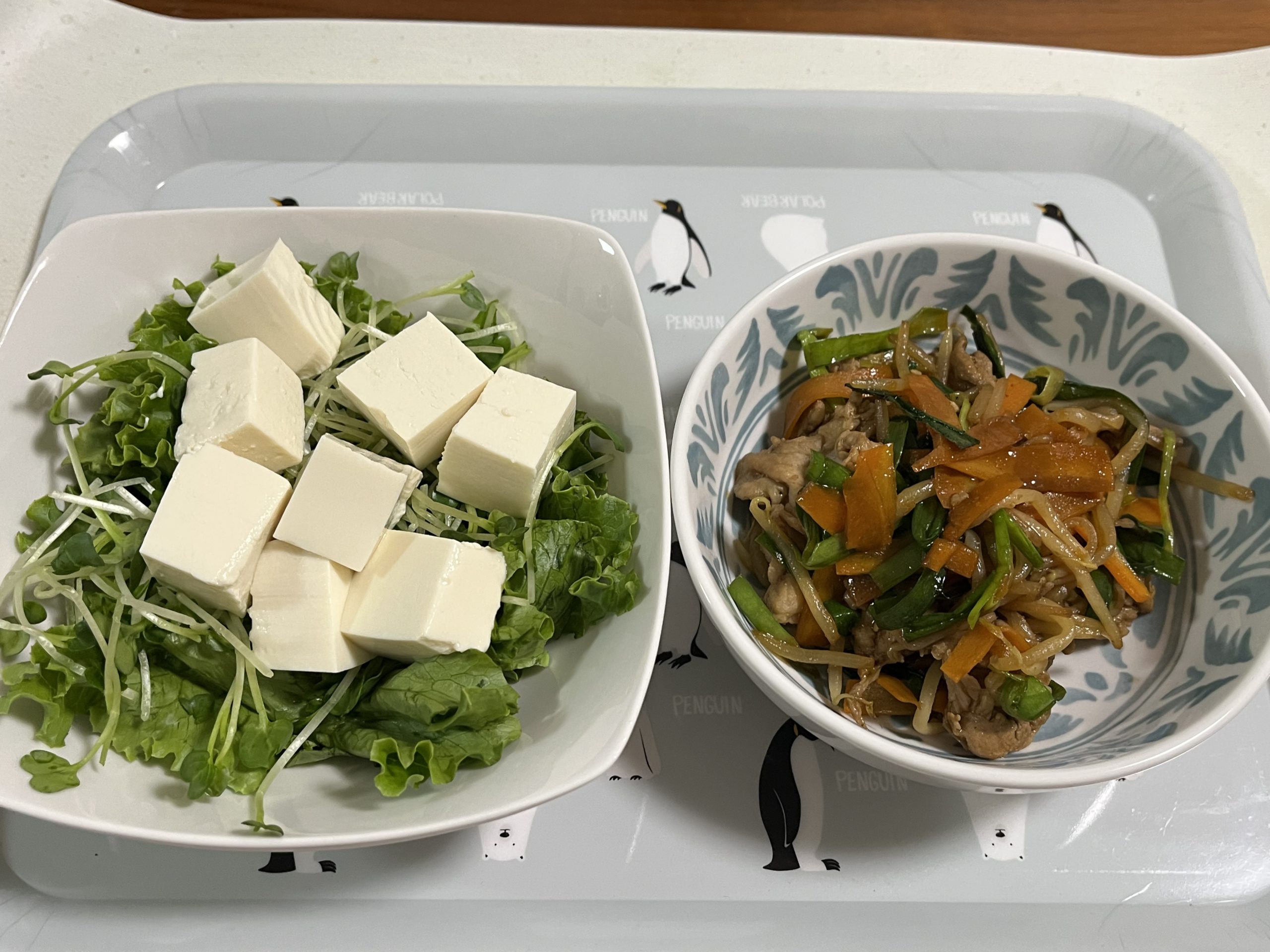 豚肉のスタミナ炒め(しき菜) ヨシケイ X Facebook はてブ Pocket LINE コピー 2025.08.28 8/28 『しき菜』2品です ・豚肉のスタミナ炒め ・豆腐サラダ 豚肉のスタミナ炒め豆腐サラダ レシピは すべての材料は 野菜の産地は グリーンリーフ『福岡』、にら『高知』、人参『北海道』 かいわれ大根の調子が悪かったよ 『豚肉のスタミナ炒め』豚肉に酒&醤油をもみこみ、人参&もやしと炒める。火が通ったらニラを加えさっと炒めてタレを加えてからめて完成。 『豆腐のサラダ』豆腐は水をきり、食べやすく切る。カイワレ大根、レタスと共に盛って完成。 ごちそうさまでした♪
