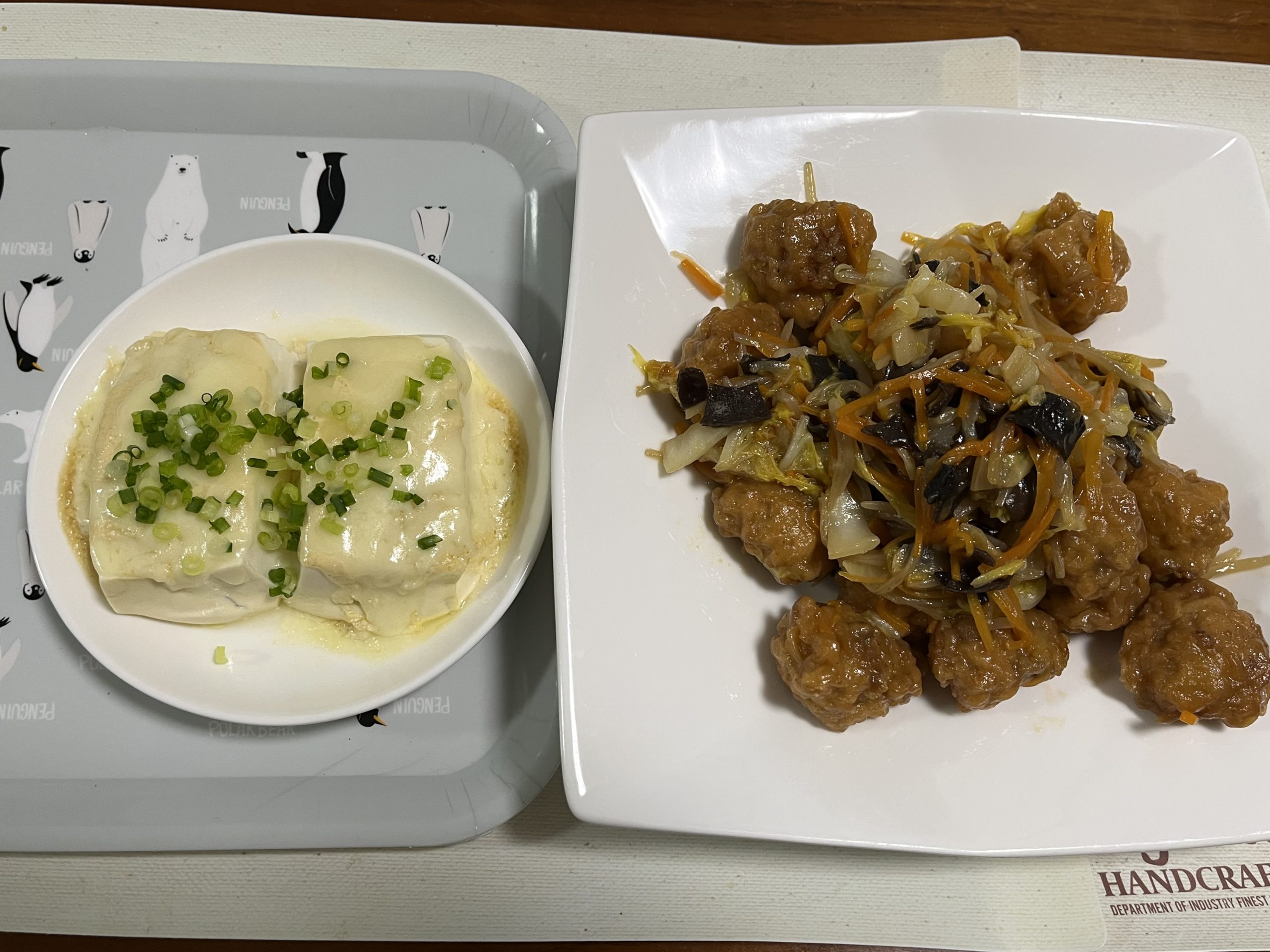 左の豆腐は1人分、右の豚から揚げは2人分です。