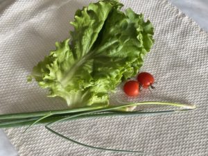 グリーンリーフ『福岡』、玉ねぎ『北海道』、小ネギ『佐賀』、ミニトマト『長崎』