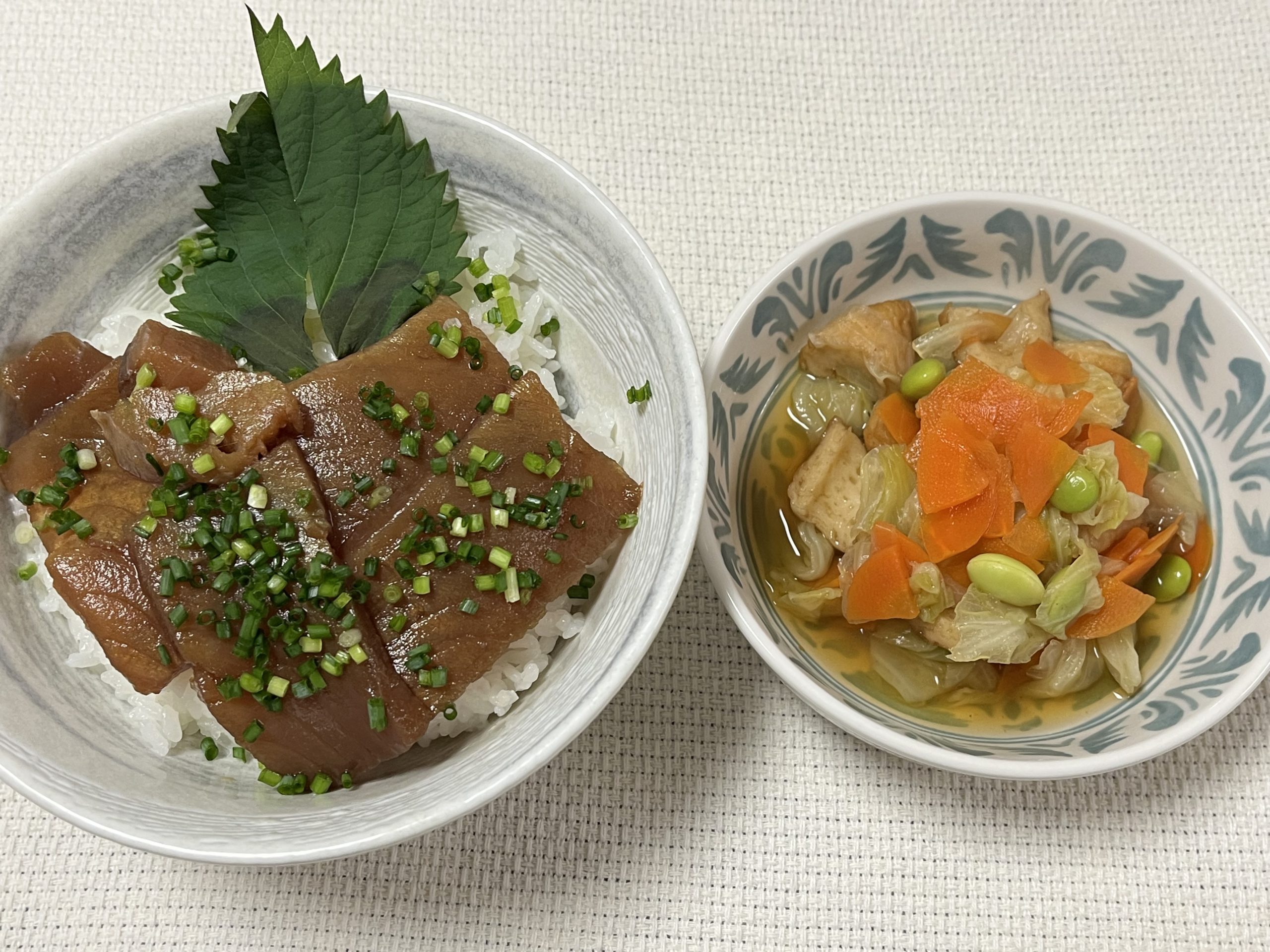 『焼ちくわと野菜のあっさり煮』は材料切って煮込んで最後に冷凍枝豆入れてさっと煮れば完成だし、『まぐろ丼』は解凍して暖かいご飯に乗せるだけ!
