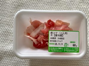 たけのこの水煮は『中国産』、右の『粉ラー油』はヨシケイでも販売されてて美味しいよ