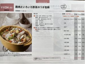 鶏肉といろいろ野菜のうま塩鍋(スマイリーミール) ヨシケイ X Facebook はてブ Pocket LINE コピー 2025.11.24 11/24は『スマイリーミール』 ・鶏肉といろいろ野菜のうま塩鍋 鶏肉といろいろ野菜のうま塩鍋 すべての材料は 野菜の産地は 白菜&大根&人参『鹿児島』、長ネギ『大分』 鍋なので簡単! 鍋に水とタレを煮立て、鶏肉を加えてアクを取ったら、残りの材料を入れて煮込めば完成! ごちそうさまでした♪