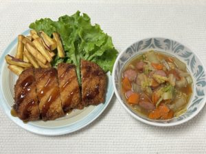 『チーズとんかつ』は揚げるだけ。付け合わせのさつまいもはラップで包み電子レンジ加熱して棒状に切って揚げる。