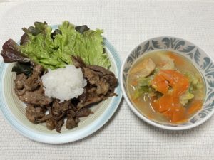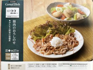 豚肉のおろしのせ(カジュアルディッシュ) ヨシケイ X Facebook はてブ Pocket LINE コピー 2025.12.22 12/22 『カジュアルディッシュ』2品です ・豚肉のおろしのせ ・がんもと野菜の塩麹煮 豚肉のおろしのせがんもと野菜の塩麴煮 レシピは すべての材料は 野菜の産地は サニーレタス『福岡』、人参『長崎』、大根&キャベツ『鹿児島』、長ネギ『大分』 『豚肉のおろしのせ』豚肉は酒&醤油をもみ込んで焼き、大根おろしをのせる。 『がんもと野菜の塩麴煮』だし汁、醤油、みりんに材料入れて煮立て、塩麹加えて煮る。 ごちそうさまでした♪