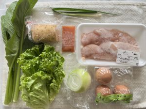 青菜&グリーンリーフ『福岡』、小ネギ『佐賀』。長芋『青森』、玉ねぎ『北海道』