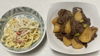 ヨシケイ 牛じゃが(カジュアルディッシュ) 1/5 『カジュアルディッシュ』2品です・牛じゃが・ごぼう入りスパゲティサラダレシピはすべての材料はじゃがいも『長崎』、ごぼう『青森』、玉ねぎ『北海道』牛コマ肉国産です『牛じゃが』材料入れてアクを取って煮込んで火が通ったら枝豆入れて完成。『... 2026.01.05 ヨシケイ