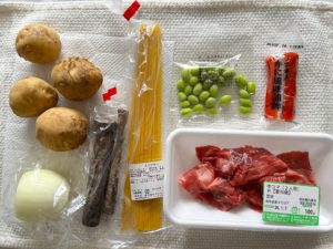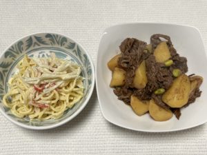 牛じゃが(カジュアルディッシュ) ヨシケイ X Facebook はてブ Pocket LINE コピー 2026.01.05 1/5 『カジュアルディッシュ』2品です ・牛じゃが ・ごぼう入りスパゲティサラダ 牛じゃがごぼう入りスパゲティサラダ レシピは すべての材料は じゃがいも『長崎』、ごぼう『青森』、玉ねぎ『北海道』 牛コマ肉国産です 『牛じゃが』材料入れてアクを取って煮込んで火が通ったら枝豆入れて完成。 『ごぼう入りスパゲティサラダ』スパゲティを半分に折って茹でる。途中ごぼうを加える。 水気をきってかにかま入れてマヨネーズ&塩コショウで和える。 ごちそうさまでした♪