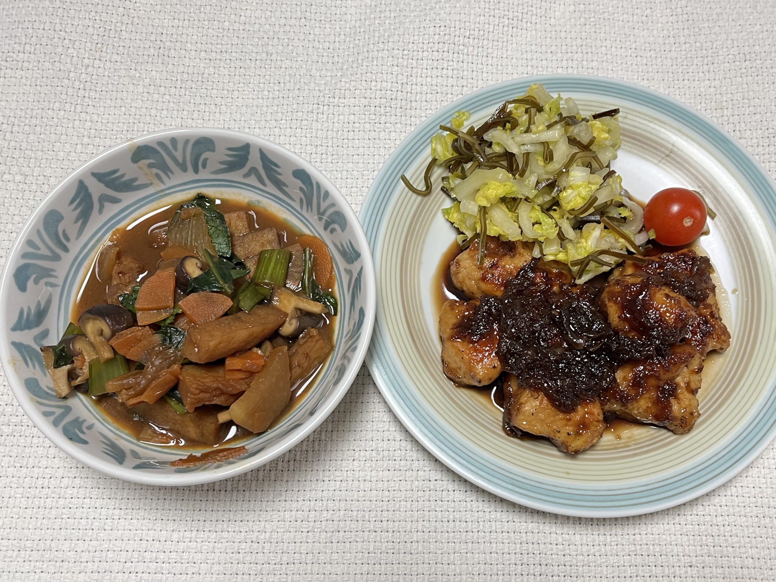 鶏肉のしょうが焼き(スマイリーミール) ヨシケイ X Facebook はてブ Pocket LINE コピー 2026.01.21 1/21 『スマイリーミール』2品です ・鶏肉のしょうが焼き ・五目炒め煮 鶏肉のしょうが焼き五目炒め煮 すべての材料は 野菜の産地は 白菜『鹿児島』、青菜『福岡』、人参&大根&しいたけ&ミニトマト『長崎』、玉ねぎ『北海道』、しょうが『高知』 『鶏肉のしょうが焼き』鶏肉焼いて生姜を混ぜて作ったたれをかけて完成。 『五目炒め煮』青菜以外を煮て、最後に青菜加えてさっと煮たら完成! ごちそうさまでした♪